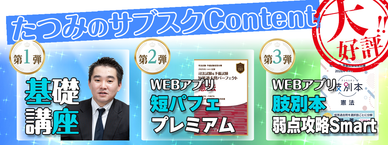 辰已法律研究所の講座 予備試験 予備試験ルートで法曹を目指す方へ。講師は受験指導に精通した実務家が中心。基礎知識のインプット、過去問分析から、本試験レベルの実戦的な答案練習会・模試まで。 デジタルパンフレット 予備試験情報 講座案内 書籍・DVD 無料ガイダンス/イベント 講師紹介 合格者・受講生の声 予備・司法チャンネル MORE 司法試験 司法試験受験指導50年の実績。本試験を徹底的に分析し、業界スタンダードを確立した答案練習会や模試を提供します。経験豊富な実務家による正統派の指導が特色です。 デジタルパンフレット 司法試験情報 講座案内 書籍・DVD 無料ガイダンス/イベント 講師紹介 合格者・受講生の声 予備・司法チャンネル MORE 法科大学院 司法試験、予備試験で培った、ノウハウに基づく法律科目対策のほか、未修者コース受験者向けに、小論文対策、志望理由書・面接対策の講座を用意しています。 デジタルパンフレット 法科大学院情報 講座案内 書籍・DVD 無料ガイダンス/イベント 講師紹介 合格者・受講者の声 予備・司法チャンネル MORE 司法書士 はじめて司法書士試験に挑戦する方のためのすべてがパックされた基礎講座のほか、択一式・記述式対策のための中上級講座まで、あらゆるレベルの受講生のニーズに応えます。 デジタルパンフレット 司法書士試験情報 講座案内 書籍・DVD 無料ガイダンス/イベント 講師紹介 合格者・受講生の声 司法書士チャンネル MORE 社労士 辰已法律研究所とキャリアテラスとの業務提携により、佐藤塾ブランドの社労士試験対策講座を提供しています。独学者、他校出身者が1年で合格を掴んでいます。 デジタルパンフレット 社会保険労務士試験情報 講座案内 書籍・DVD 無料ガイダンス/イベント 講師紹介 合格者・受講生の声 社労士チャンネル MORE 行政書士 辰已法律研究所とリーダーズ総合研究所との業務提携により、行政書士試験対策講座を提供しています。初学者から再受験生まで最適な講座選択が可能です。 デジタルパンフレット 行政書士試験情報 試験対策講座案内 開業・実務講座案内 無料ガイダンス/イベント 講師紹介 合格者・受講生の声 行政書士チャンネル MORE 宅建 宅建業に従事する方を対象に、実用的な知識を習得させる宅建登録講習を実施。講習を受けて修了試験に合格すると、宅建試験において一部(5問)が免除されます。 デジタルパンフレット 講座案内 MORE AI・ITスキル 講座案内 MORE トピックス 2026.04.10社労士 【お知らせ】「第58回(令和8年度)社会保険労務士試験について」が公開されました。 2026.04.06社労士 【お知らせ】4月11日(土)個別学習相談会のお知らせ 2026.04.04予備試験司法試験法科大学院 【お知らせ】肢別本が ≪サブスク≫ WEBアプリになって登場! 『肢別本弱点攻略Smart』発売開始! 2026.04.03予備試験司法試験法科大学院 【お知らせ】『西口講師による 基本の「き」 出版記念特別無料講演会』を掲載しました。 2026.04.02法科大学院 【試験情報】「法科大学院の試験情報」について更新しました。 MORE