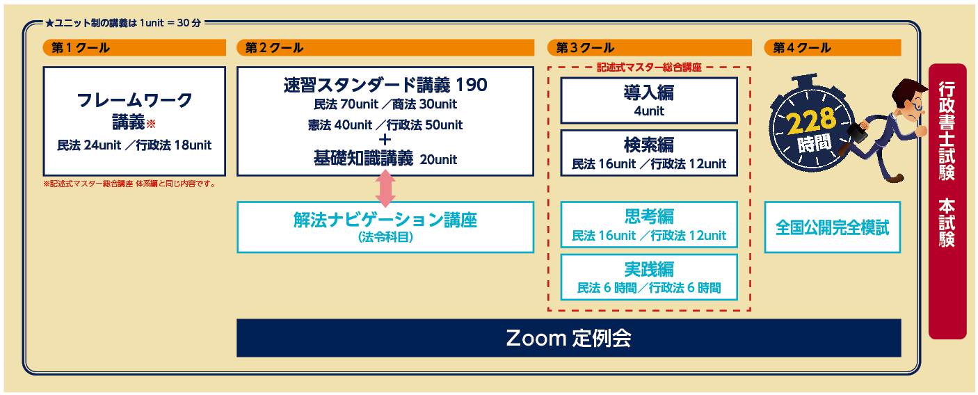 時間のない社会人のために特別に設計された速習スタンダード講義190と効率よく出題パターンと解法パターンを身につけられる「解法ナビゲーション講座」と記述式対策の「記述式マスター総合講座」に模擬試験をセットにした短期決戦カリキュラムです。
