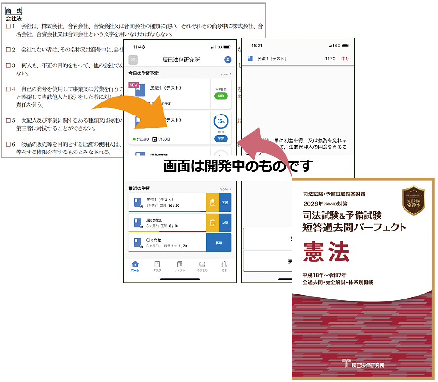 アプリには、辰已オリジナルの「短答基本知識 800 肢」(10月配信予定)、辰已の短パフェから汎用性の高い問題のみを抽出した「短パフェ重要問題セレクション」(2 月配信予定)を搭載します。