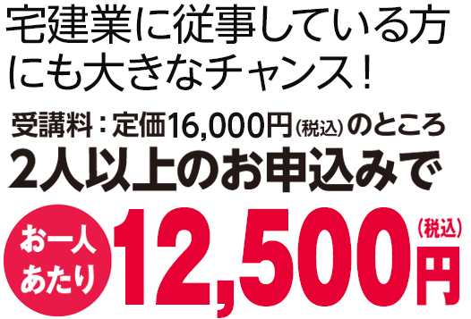 辰已の登録講習は16,000円。2名様以上で申し込む場合は、1人あたり12,500円です。 3月31日(火)までにお申込みいただくと早期割引で1名様でも12,500円です。 ※なお、ご解約につきましてスクーリング開講前はお申込み金の20%、開講後は100%の解約料をお申し受けます。
