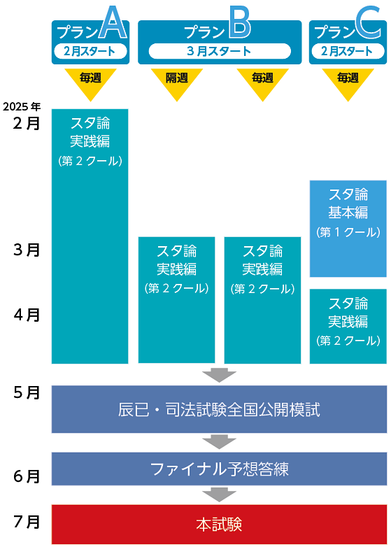 2月から週1回受講。リズムよく学習し、答案練習会の合間に選択科目を強化できる。戦略面でも優れた辰已の推奨コースです。