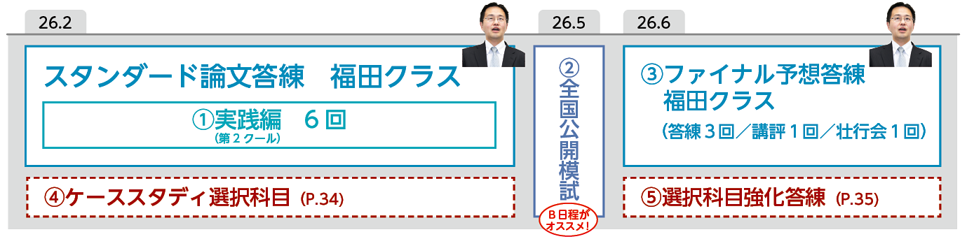 全国公開模試後も本試験ギリギリまで福田先生の一貫指導を受けることができるコースです。答案の書き方を「基本→実践→完成」まで、福田先生と一緒に引き上げます。