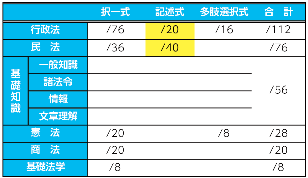 行政法は、112点中20点(約18%)ですが、民法は、76点中40点(約53%)というように、択一式よりも、記述式の方が配点が高くなっています。
