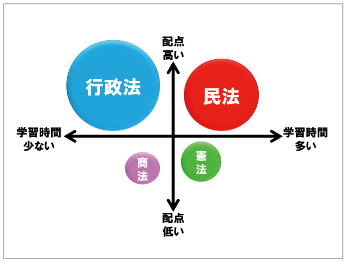 これに対して、行政法は、民法に比べて学習量も少なく、単純な知識を問う問題が多いため、本試験で高得点を取るために、民法ほど時間がかかりません。