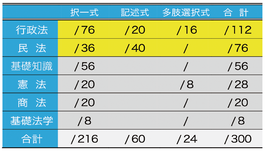 行政書士試験は、300点満点中、行政法が112点(約37%)、民法が76点(約25%)、両者を合わせると188点で全体の約63%を占めます。