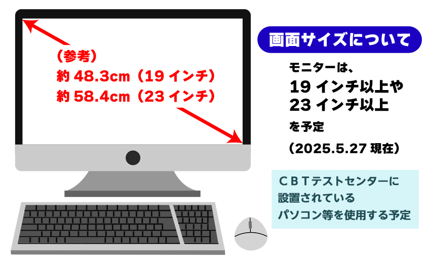 法務省では、司法試験・予備試験のCBTではノートパソコン(16インチ以上)を用意すると発表しています、CBTセンターに設置されているデスクトップパソコン (19インチ以上や23インチ以上など)を使用予定と発表されました(2025.5.27)。