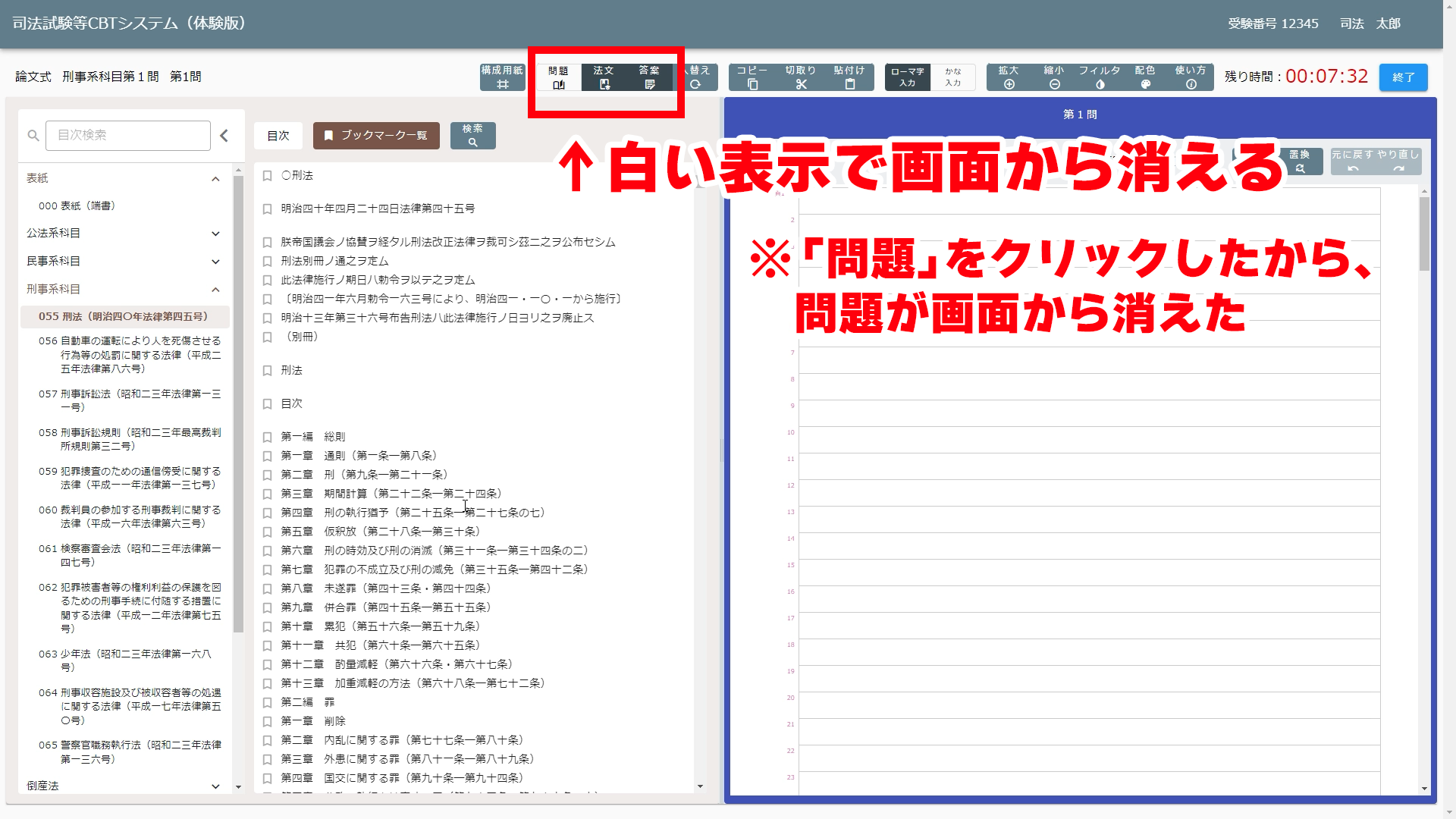 次に、問題、法文(条文)、答案用紙の画面切り替えについてです。