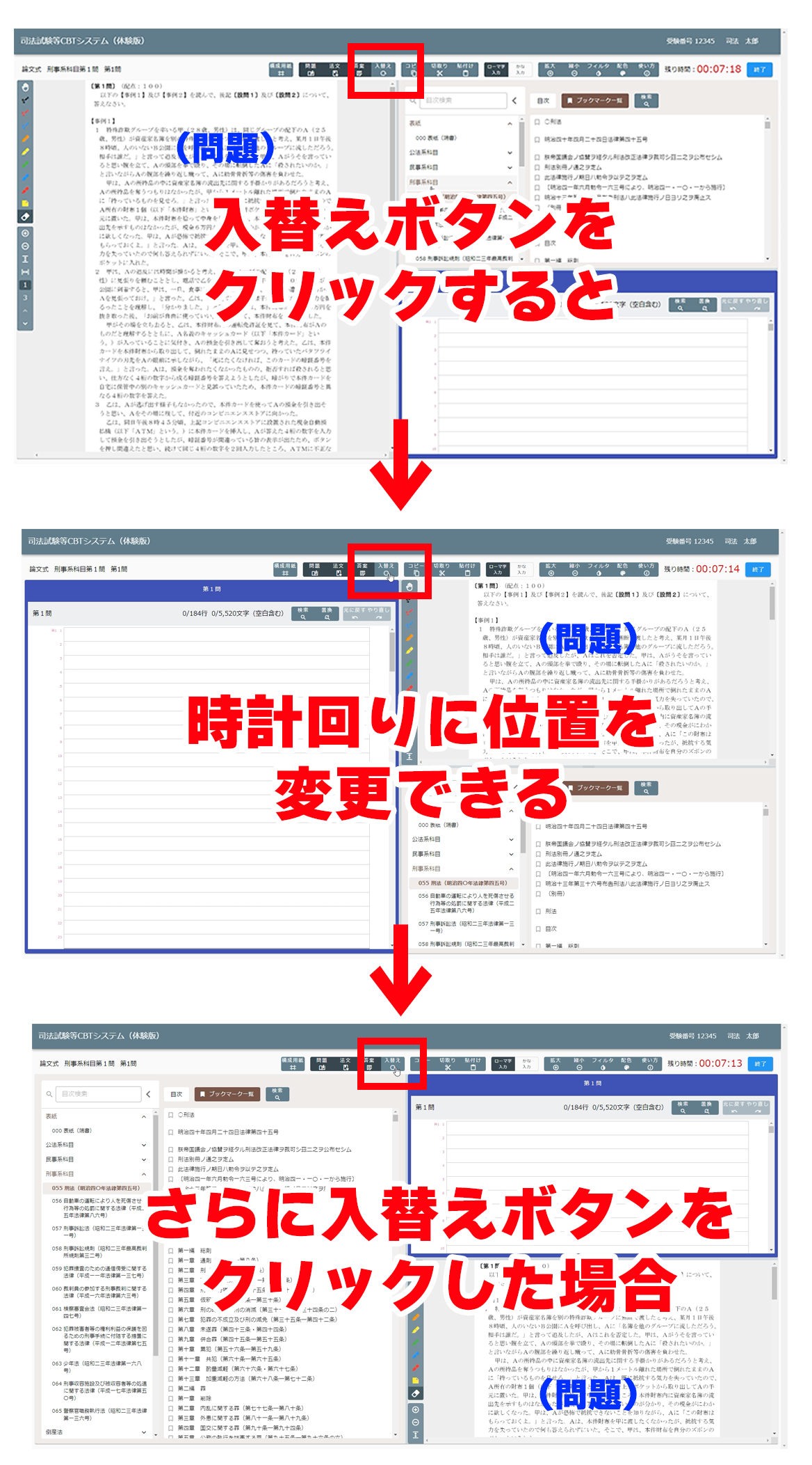 問題、法文(条文)、解答用紙が、入れ替えボタンをクリックするごとに、時計回りで位置が入れ替わります。