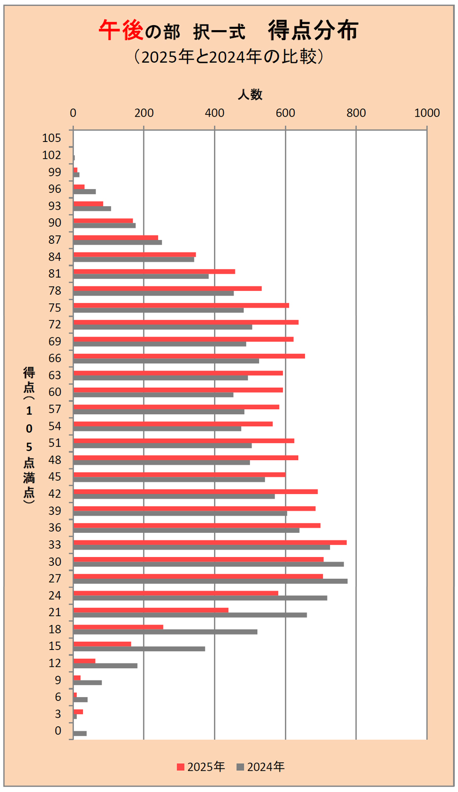 今年は午前の部・午後の部択一式ともに基準点が昨年と同じという結果であり、以上に述べたように、午前の部の高得点域での人数増加があった点以外は従来の得点分布からの大きな変化はみられませんでした。