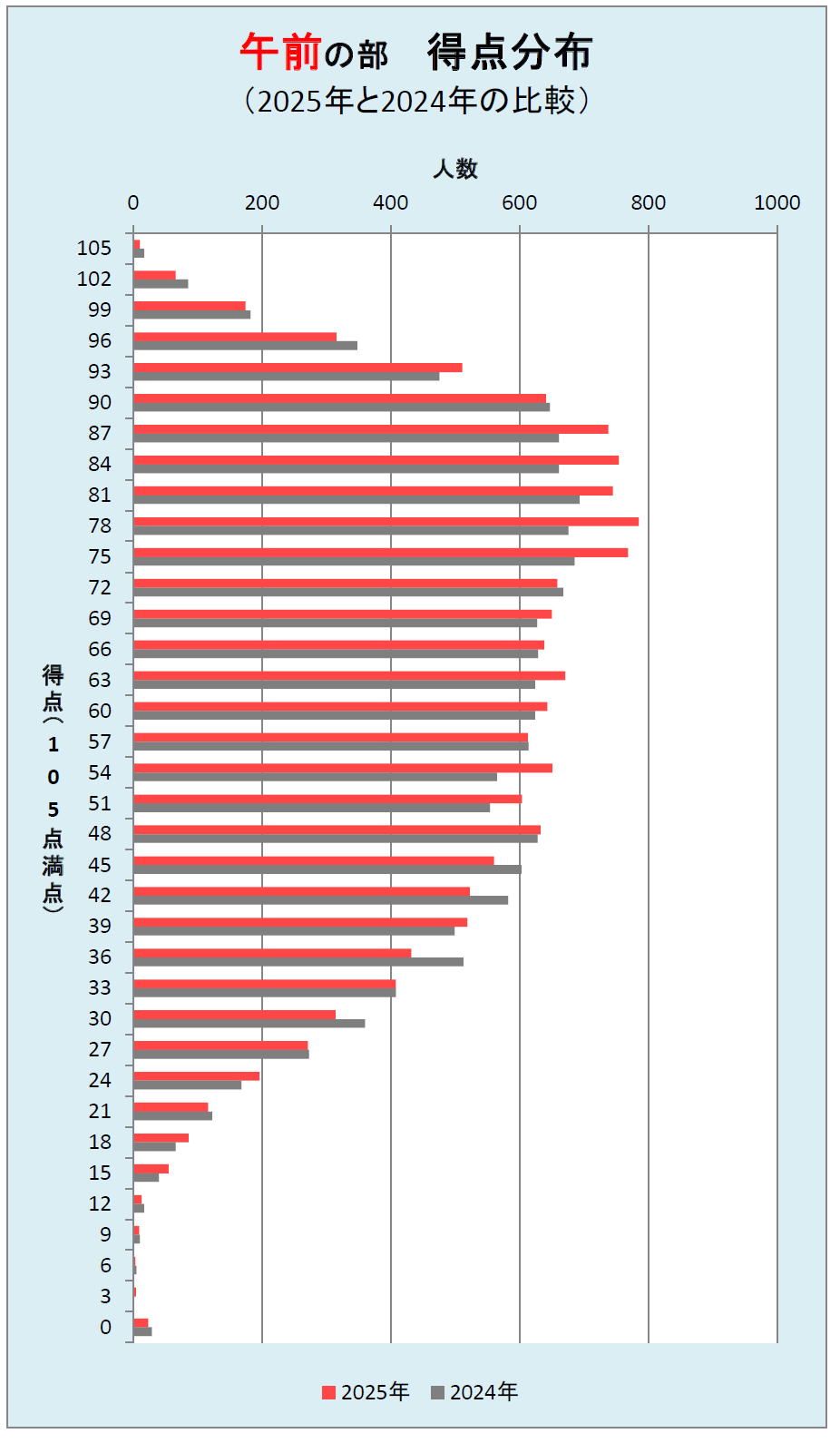上記のように、午前の部の基準点は昨年と同じでした。得点別にみると、75点から基準点を挟んで87点までの得点域での人数増加が目立ちます。例年の午前の部のグラフは中心付近が高い1つの山となることが多いのですが、今年は上記得点域だけ突出して人数の多いグラフとなっており、来年以降も高得点者の増加傾向が続くのかが注目されます。