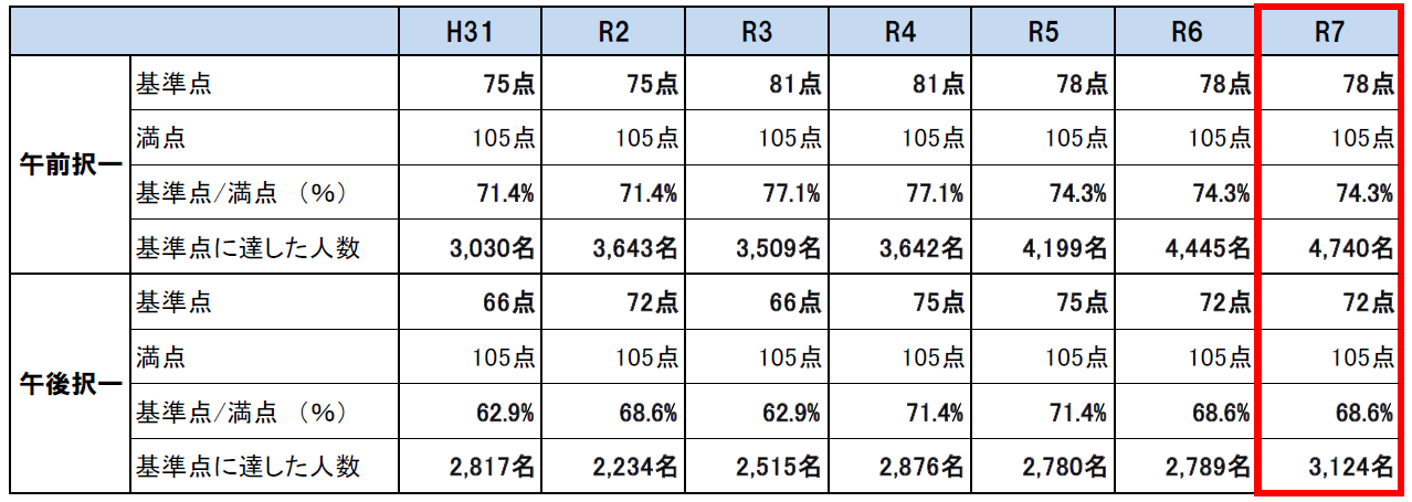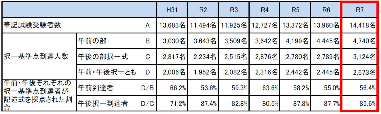 令和7年度は、午前の部の基準点が78点(26問)、午後の部択一式の基準点が72点(24問)となりました。午前の部・午後の部択一式ともに昨年と同じ基準点です。