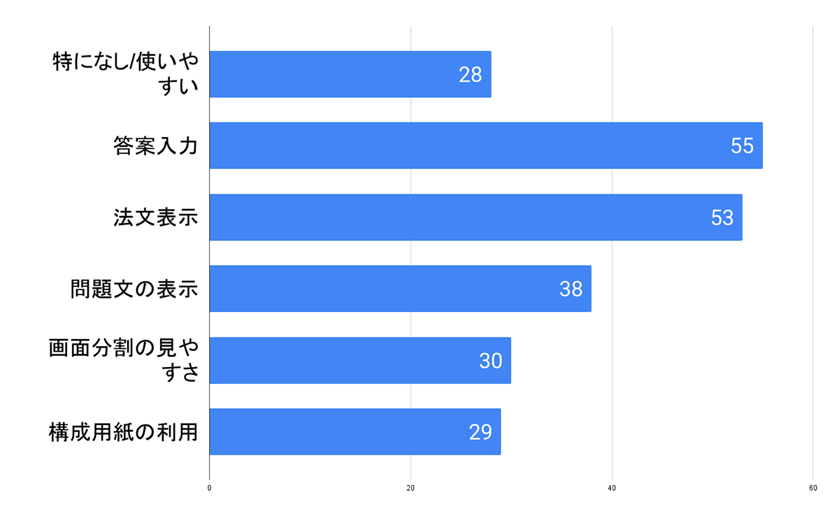 答案入力に関しては、文字入力に対してか、答案構成まで含めた点かについて、読みとることが難しい結果ではあります。