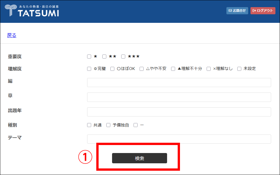 絞り込み指定画面で、一覧表示する問題の絞り込み条件を指定して「検索(①)」ボタンをクリックします。