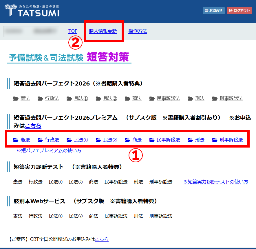 短答過去問パーフェクト2026プレミアムの科目(①)を選択してクリックします。尚、購入された科目以外はクリックができないようになっています。