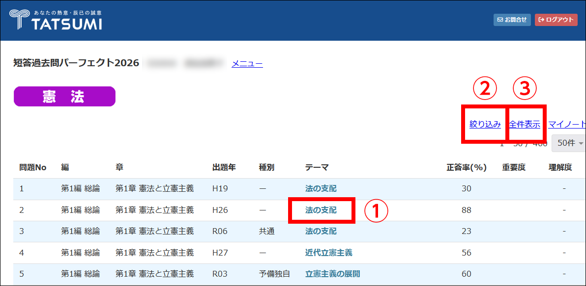 - セットアップ(生成)が完了すると、短答過去問パーフェクト2026年版の問題が一覧表示され、利用が開始できるようになります。