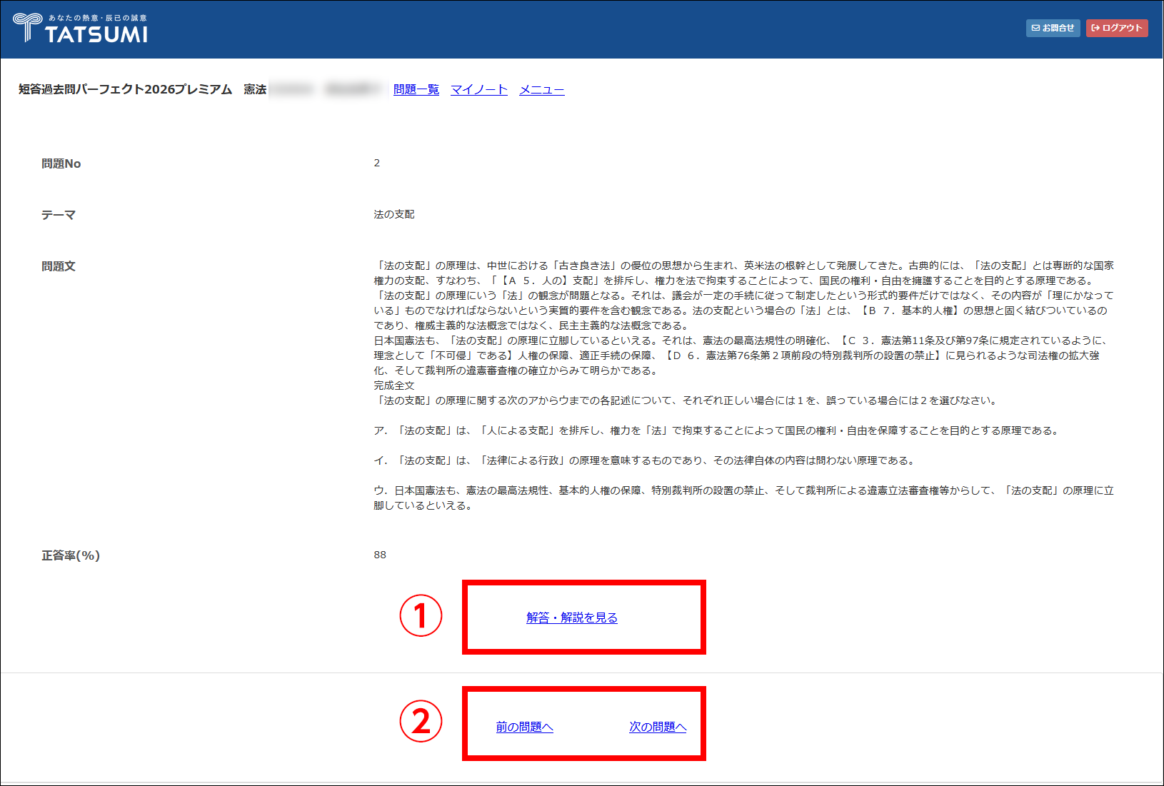 前後の問題を表示する場合は、「次の問題へ」または「前の問題へ」(②)をクリックしてください。