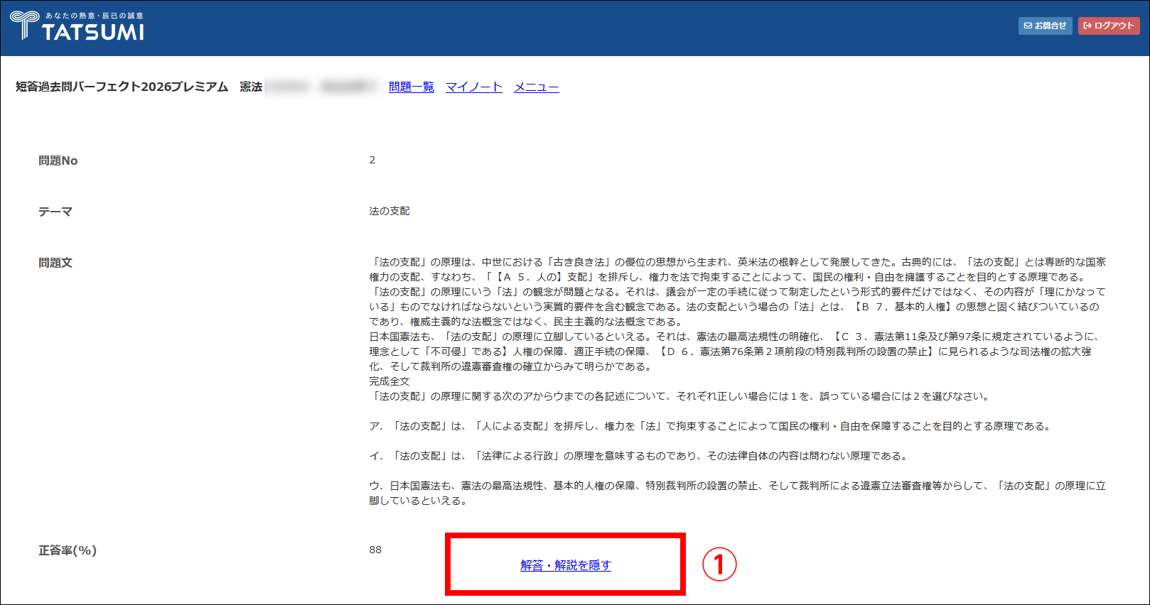 短答過去問パーフェクト2026プレミアムを利用する場合は「短答対策(①)」をクリックします。