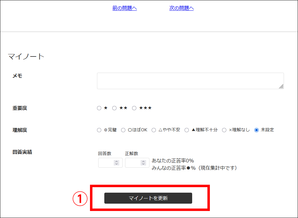 ※「マイノート更新」をクリックしないで「問題一覧」へ戻ったり、「次の問題、前の問題」をクリックすると、内容は登録されませんので、注意してください。