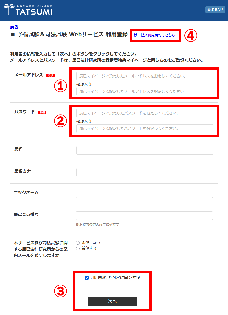 尚、メールアドレスとパスワードは、辰已受講者特典マイページで登録したものと同じものを、必ずご入力ください。