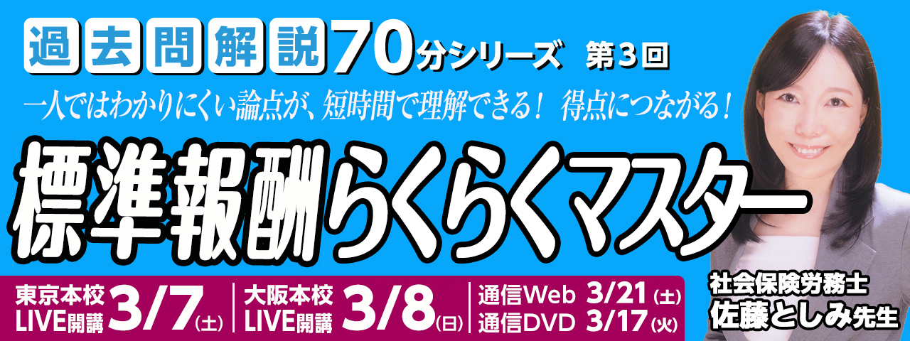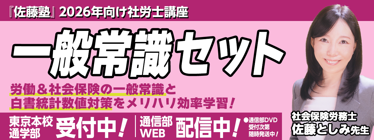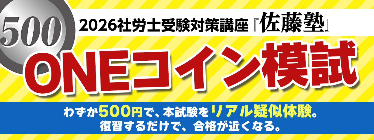 最新情報 2026.03.16社労士 【お知らせ】3月20日(金・祝)個別学習相談会のお知らせ 2026.03.16社労士 国民年金法③ 講義無料体験のお知らせ 2026.03.09社労士 過去10年条文順問題集・第4巻(国年・厚年) 発売しています 2026.03.03社労士 【お知らせ】 『ONEコイン模試』 好評受付中!! 2026.03.01社労士 【3月前半の課題】他資格受験生はこんなもんじゃない。 MORE デジタルパンフレット 社会保険労務士試験対策講座のパンフレットをWebでご覧いただけます。紙のパンフレットの請求も可能です(無料送付)。 資料請求はこちら スマートフォンでのパンフ印刷 社会保険労務士試験情報 社会保険労務士試験に関する情報や、全国社会保険労務士会連合会 試験センターが公開している試験情報をご覧いただけます。 講座案内 2026年(令和8年)試験対策の講座をご案内しています。講座内容を確認できるほか、Web上でお申込みいただくことも可能です。 無料ガイダンス/イベント 無料で実施する公開講座・ガイダンスのご紹介です。オンライン視聴(YouTube)のほか、辰已本校でのLIVE実施がある場合もあります。 講師紹介 佐藤塾の誇る講師陣を紹介します。受験指導経験豊富な実務家(社会保険労務士)です。 書籍 社会保険労務士試験対策に定評ある佐藤塾の書籍をオンラインで直接購入できます。 合格者・受講生の声 佐藤塾の講座を利用して合格された合格者の体験談や現在佐藤塾で講座を受講されている方の生の声をご紹介します。 社労士チャンネル 辰已法律研究所×佐藤塾の辰已社労士YouTubeチャンネルです。試験情報や勉強方法、講座ガイダンスや公開講座までコンテンツ盛りだくさんでお届けします。 Pick Up情報 2025年社会保険労務士 本試験後のイベント NEW ・本試験 解答速報 ・本試験大分析会 ・本試験択一式解説 ・合否を分けた問題はこれだ! ・社会保険労務士の将来展望と試験概要(初学者向けガイダンス) ・Web成績分析診断 辰已法律研究所・社労士YouTubeチャンネル 社会保険労務士試験ブログ「佐藤塾」 社会保険労務士 資料請求/デジタルパンフレット 社会保険労務士試験情報 講座案内 書籍・DVD 無料ガイダンス/イベント 講師紹介 合格者・受講生の声 社労士チャンネル