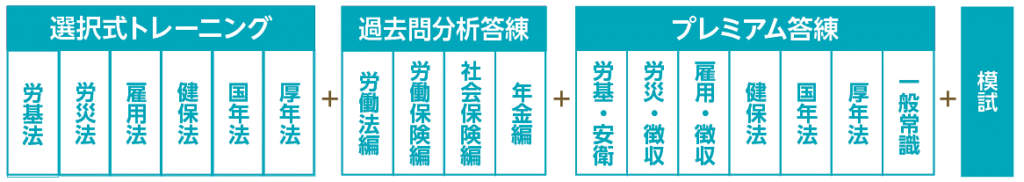 労働基準法1回、労災保険法1回、雇用保険法1回、健康保険法1回、国民年金法1回、厚生年金保険法1回、一般常識1回