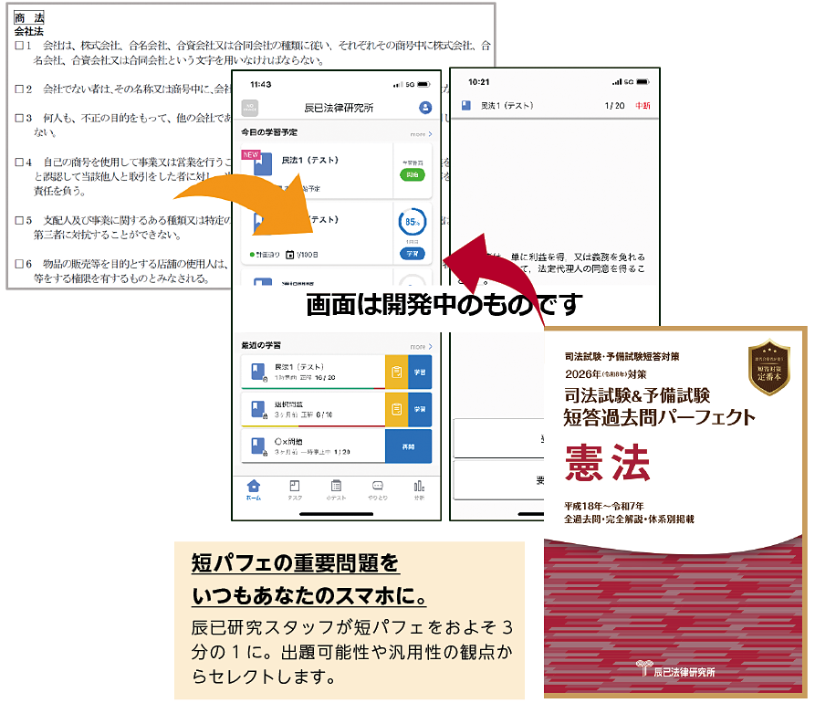 あなたの短答学習の相棒を作りました。 アプリには、辰已オリジナルの「短答基本知識1500肢」(8月配信予定)、辰已の短パフェから汎用性の高い問題のみを抽出した「短パフェ重要問題セレクション」(2月配信予定)を搭載します。
